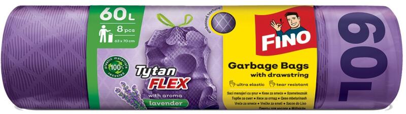 Fino aromás levendula illatú szennyeszacskók zsinórral, 60l, 8 db Fino TYTAN FLEX levendula illatú szemeteszsákok praktikus és strapabíró zsinórral, könnyen zárhatók és szállíthatók. A zsinór gondoskodik a kézhigiéniáról és a szoros fogásról akkor is, ha a táska teljesen meg van töltve. Innovatív dombornyomó technológiájuknak és 100%-ban újrahasznosított műanyagból készült 3 rétegű fóliájuknak köszönhetően rendkívül rugalmasak, szakadás- és szivárgásmentesek.