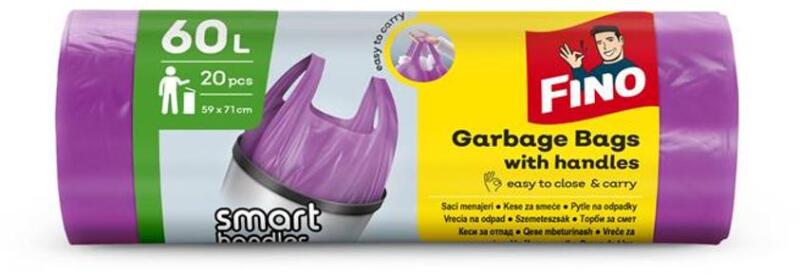 Hewa Szemeteszsák, köthető füles, 60 l, 20 db, 59x71 cm, 12 , FINO "Smart handles", lila (8571050008) - nyomtassingyen