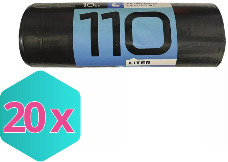 Jellemzői: Űrtartalom: 110 Liter Méret: 100x60 cm Mennyiség: 10db/tekercs; 20tekercs/karton Vastagság: 20 mikron Záródás: sima Szín: fekete Újrahasznosított anyagból készült.