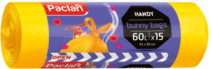 Paclan Bunny szemeteszsák, levendulaillat, 60 l, 15 db Paclan Bunny szemeteszsák vegyes hulladék gyűjtéséhez. Tartós, szakadásálló fólia.  Levendula illat. TERMÉKPARAMÉTEREK illat: levendula hossza: 90 cm szélesség: 61 cm űrtartalom: 60 l kötés/zárás: fülek kiszerelés: 15 db