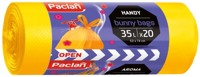 Paclan Bunny szemeteszsák egészségügyi és vegyes hulladék gyűjtésére. Kellemes, virágos illata van, és a zsákok sárga színe elfedi a tartalmát.  Paclan Bunny szemeteszsák, virágillat, 35 l, 20 db Paclan Bunny szemeteszsák vegyes hulladék gyűjtéséhez. Tartós, szakadásálló fólia.  Virágillattal. TERMÉKPARAMÉTEREK hossza: 74 cm szélesség: 53 cm vastagság: 15 m űrtartalom: 35 l szín: sárga kötés/zárás: fülek kiszerelés: 20 db
