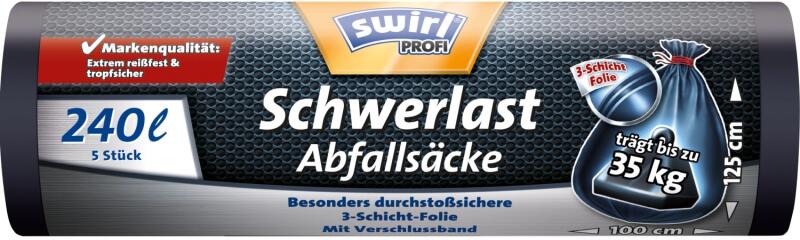 A Swirl Profi nagy teherbírású szemeteszsákok speciális, rendkívül szúrásálló, szakadás- és vízálló 3 rétegű fóliájuknak és biztonsági alapjuknak köszönhetően különösen stabilak, tartósak, és mindenféle szeméttel és hulladékkal szemben ellenállnak a nagy terhelésnek. A húzózsinórral a szemeteszsák könnyen zárható és praktikusan szállítható! A tiszta ártalmatlanítást a nagy teherbírású zsákok biztosítják.
